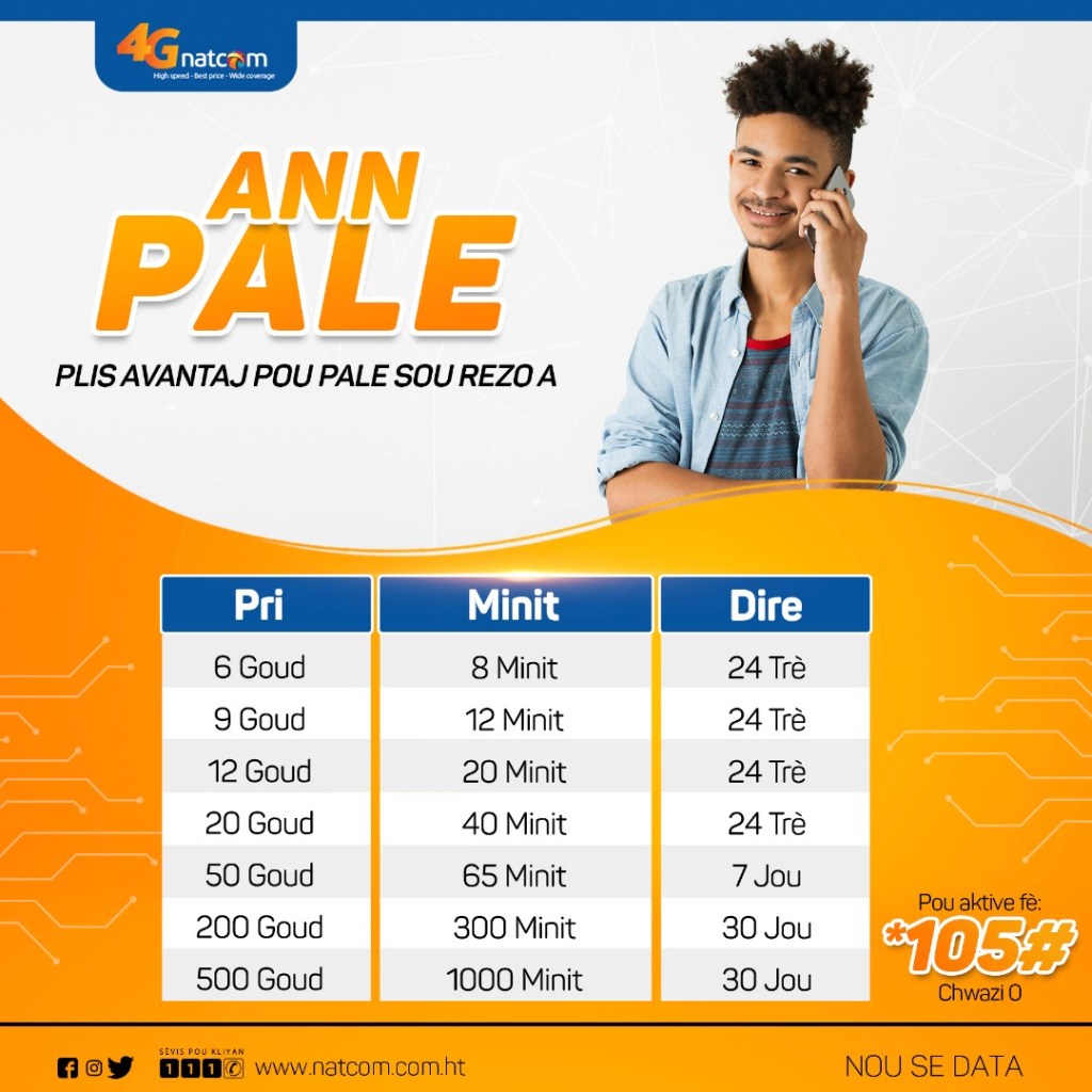 Grâce au plan « Ann Pale », à partir de 6 gourdes, la Natcom offre l’opportunité à la population haïtienne, à ses abonnés en particulier, de jouir des avantages hors pair sur une base quotidienne : 8 minutes valables jusqu’à minuit pour seulement 6 gourdes. De cette manière, la minute coûterait seulement 75 centimes. Et pour 12 gourdes, l’abonné peut se vanter de s’être connecté sur le meilleur réseau du pays en payant seulement 60 centimes par minute.