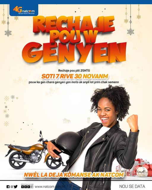 Motocyclettes, routers et cartes de recharge 1000 gourdes sont les prix à gagner pendant les trois tirages prévus pour le mois de novembre. Par-là, le géant de la télécommunication entend donner un avant-gout des opérations hors pairs qui seront menés en décembre prochain toujours au profit des citoyennes et citoyens haïtiens, ses clients en particulier. « Un tirage se tiendra chaque semaine pendant le mois de novembre», rappellent des responsables de la Natcom interrogés par PressHaiti. L’unique condition d’avoir part à ces tirages consiste à recharger son compte de base à partir de 25 gourdes. « Pour chaque recharge, le client recevra un code chance pour participer aux tirages », ont-ils précisé.