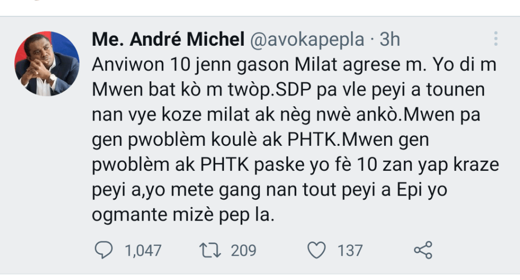 Dans un tweet publié vers 3:06pm ce 1er mai, Me. Michel a confirmé l’information. Selon lui, il aurait été agressé par des mulâtres accompagnés de certaines personnes de teint noir. La raison serait sa participation active sur la scène politique contre le Parti haïtien Tèt kale (PHTK).
