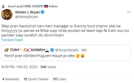 Sur Twitter, « chawa pete » entre deux stars haïtiennes, Tony Mix et Steve J. Brian. Avec la réplique de celui-ci, le duel semble prendre un autre niveau.