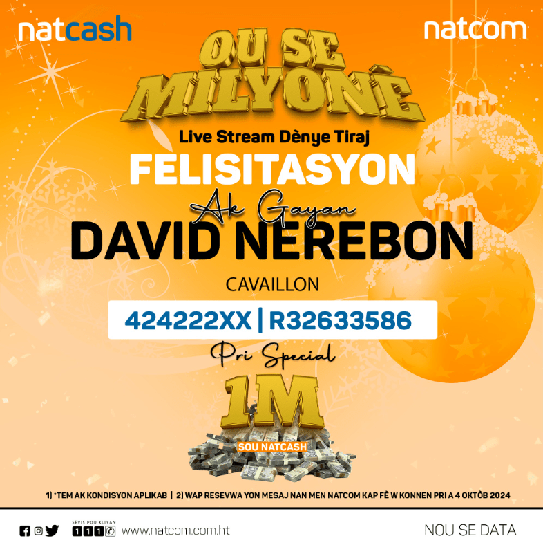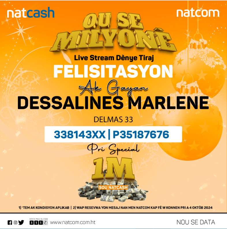 Avec sa promotion « Ou Se Milyonè », la National Telecom S.A. (Natcom) a offert à ses abonnés une opportunité unique de terminer l’année sur une note de bonheur et d’espoir. Le 27 décembre 2024, lors du dernier tirage de cette initiative, trois chanceux ont remporté le prix spécial d’un million de gourdes chacun.